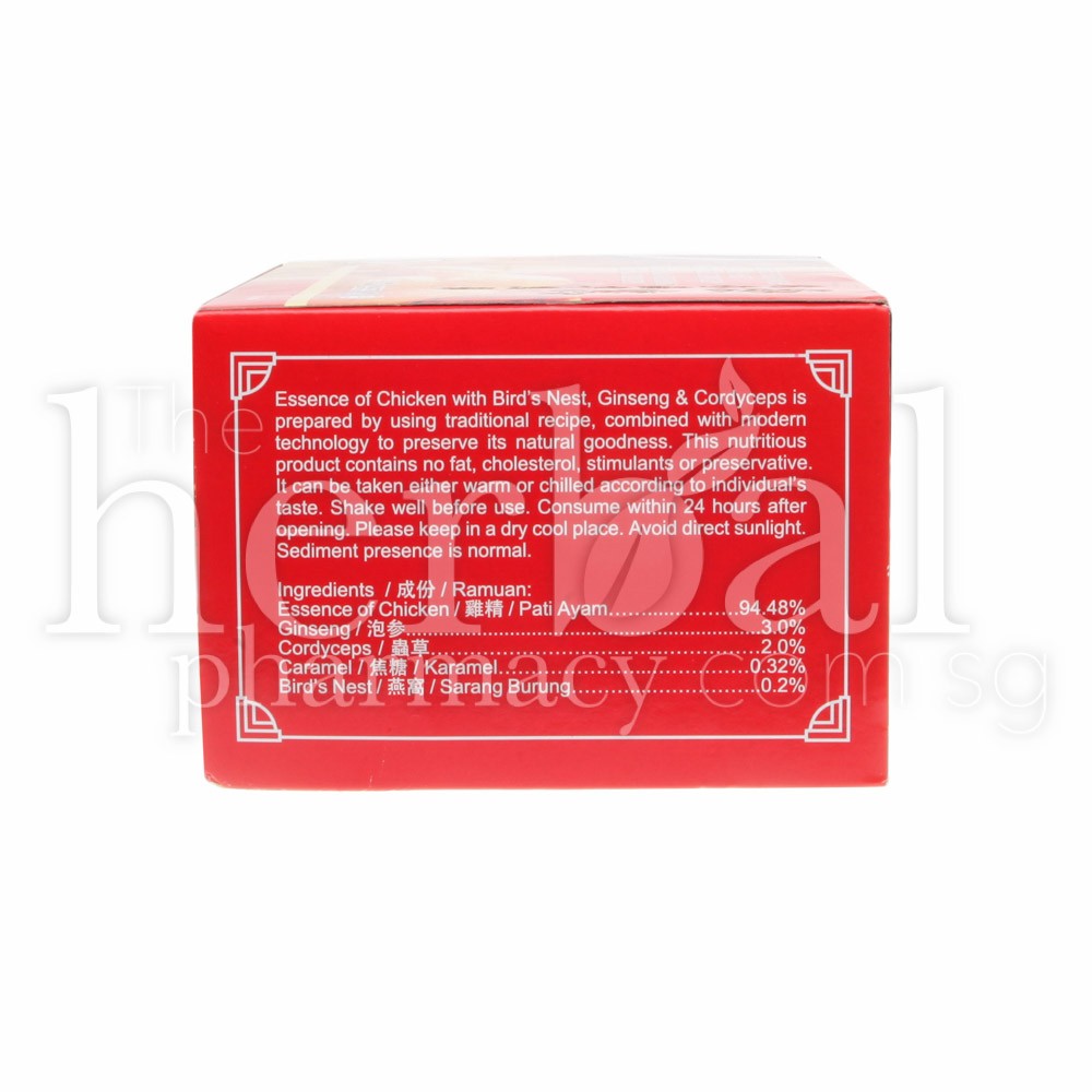 Essence of Chicken with Bird’s Nest, Ginseng & Cordyceps is prepared by using traditional recipe, combined with modern technology to preserve its natural goodness. This nutritious product contains no fat, cholesterol, stimulants or preservative. It can be taken either warm or chilled according to individual’s taste.