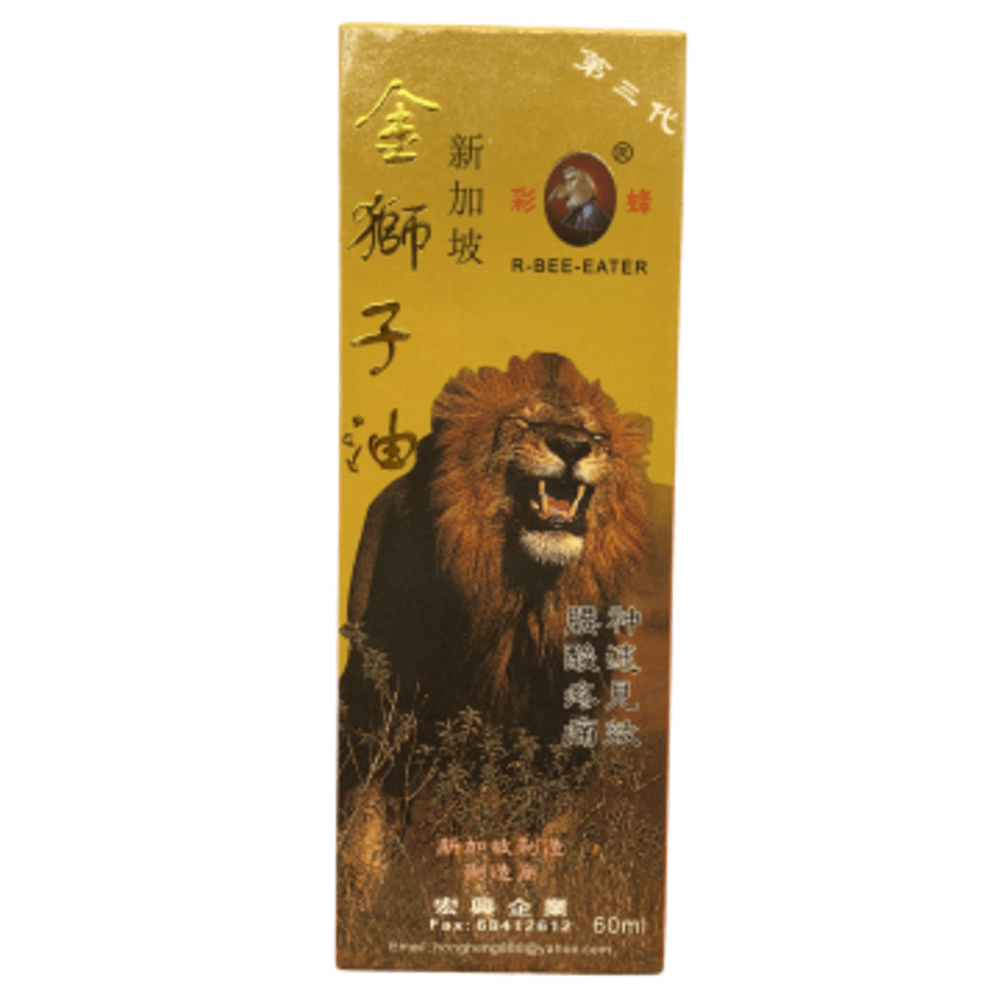 Hong Heng R-Bee-Eater GOLD LION RHEUMATIC OIL provides effective soothing relief from sore muscles, muscular pain, joint aches, bruises and sprain, cramp, backache, and pain associated with rheumatics, arthritis.