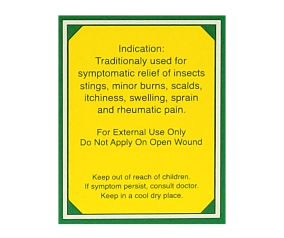 Traditionally used for symptomatic relief of insects stings, minor burns, scalds, itchiness, swelling, sprain and rheumatic pains.