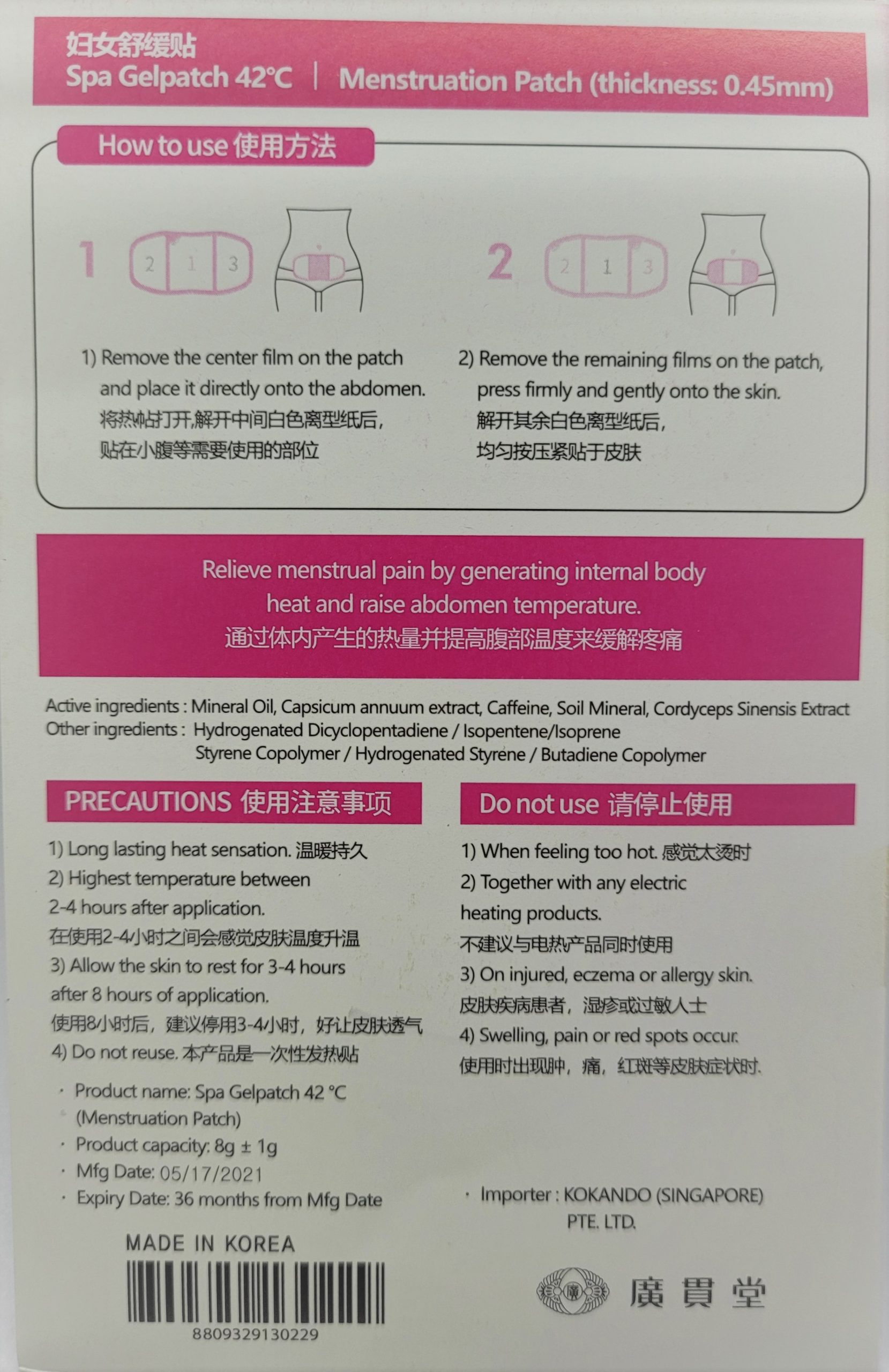 Spa Gelpatch 42℃ is to relieve menstrual pain by generating internal body heat and raising abdomen temperature.