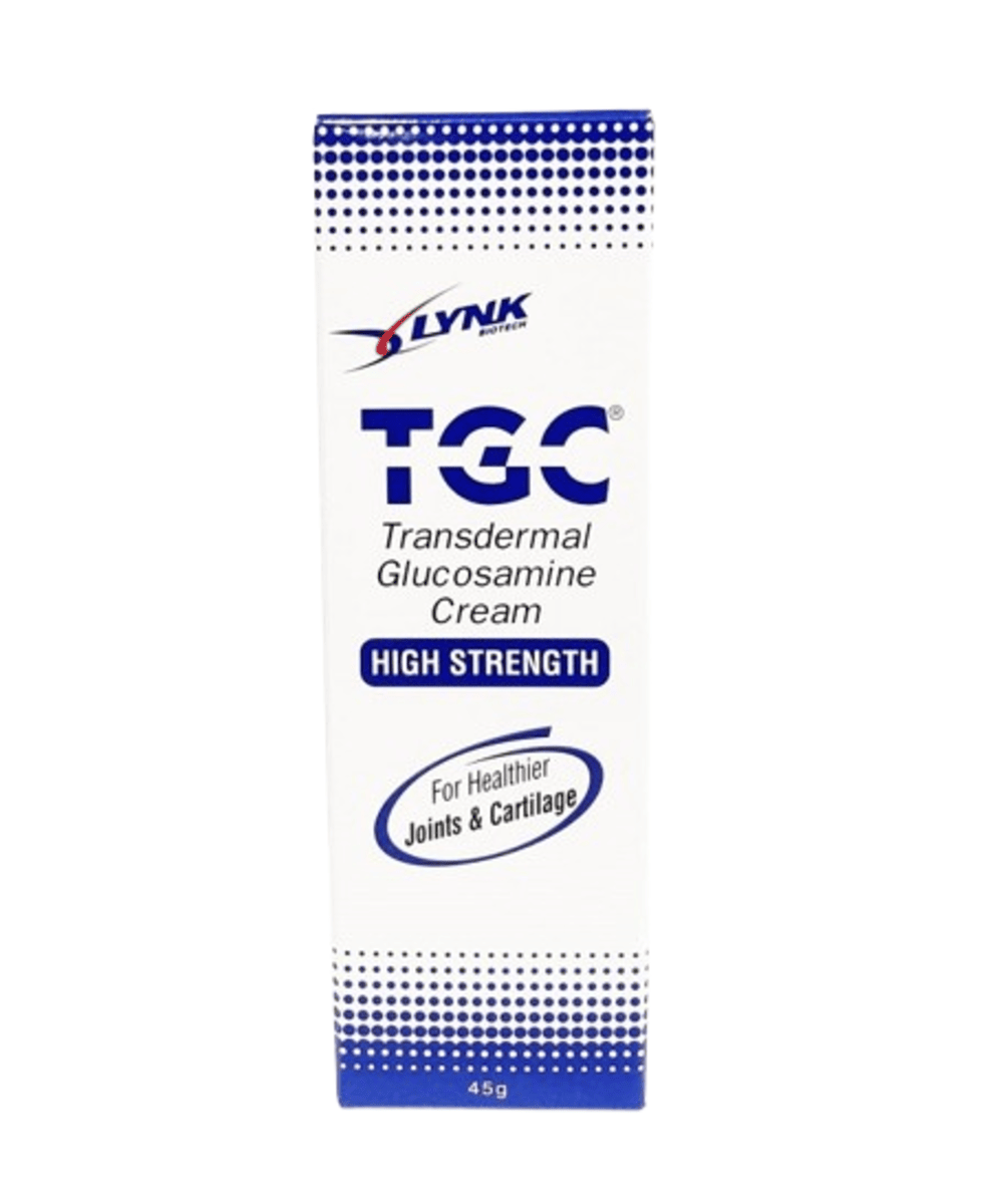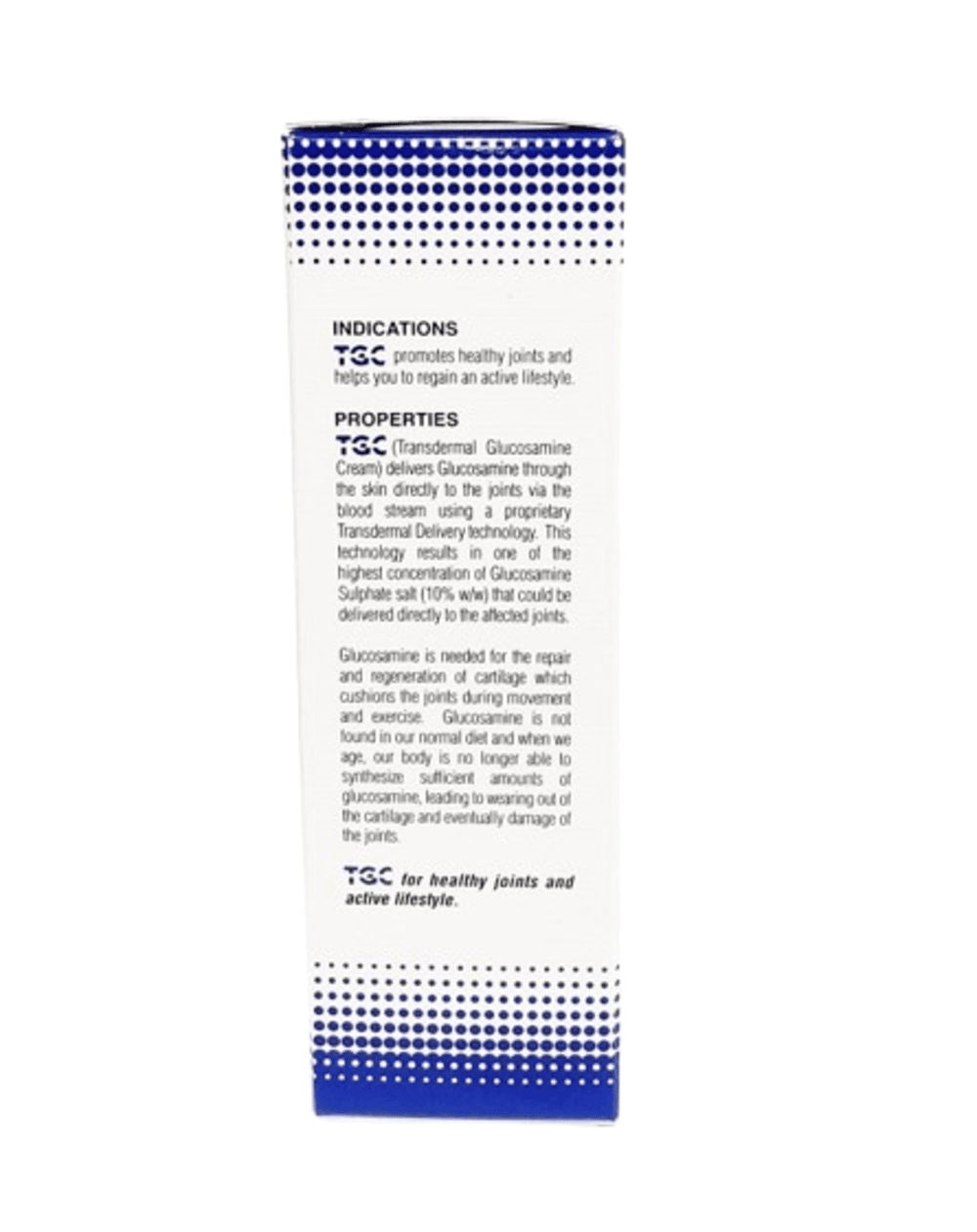 TGC promotes healthy joints and helps you to regain an active lifestyle. TGC (Transdermal Glucosamine Cream) delivers Glucosamine through the skin directly to the joints via the blood stream using a proprietary Transdermal Delivery technology. This technology results in one of the highest concentration of Glucosamine Sulphate salt (10% w/w) that could be delivered directly to the affected joints.