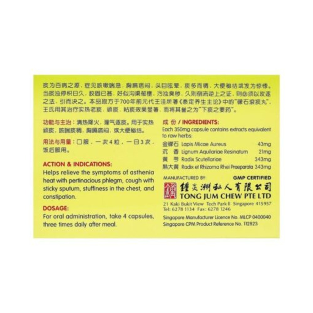 Helps relieve the symptoms of asthenia heat with pertinacious phlegm, cough with sticky sputum, stuffiness in the chest, and constipation.