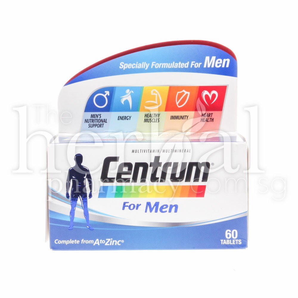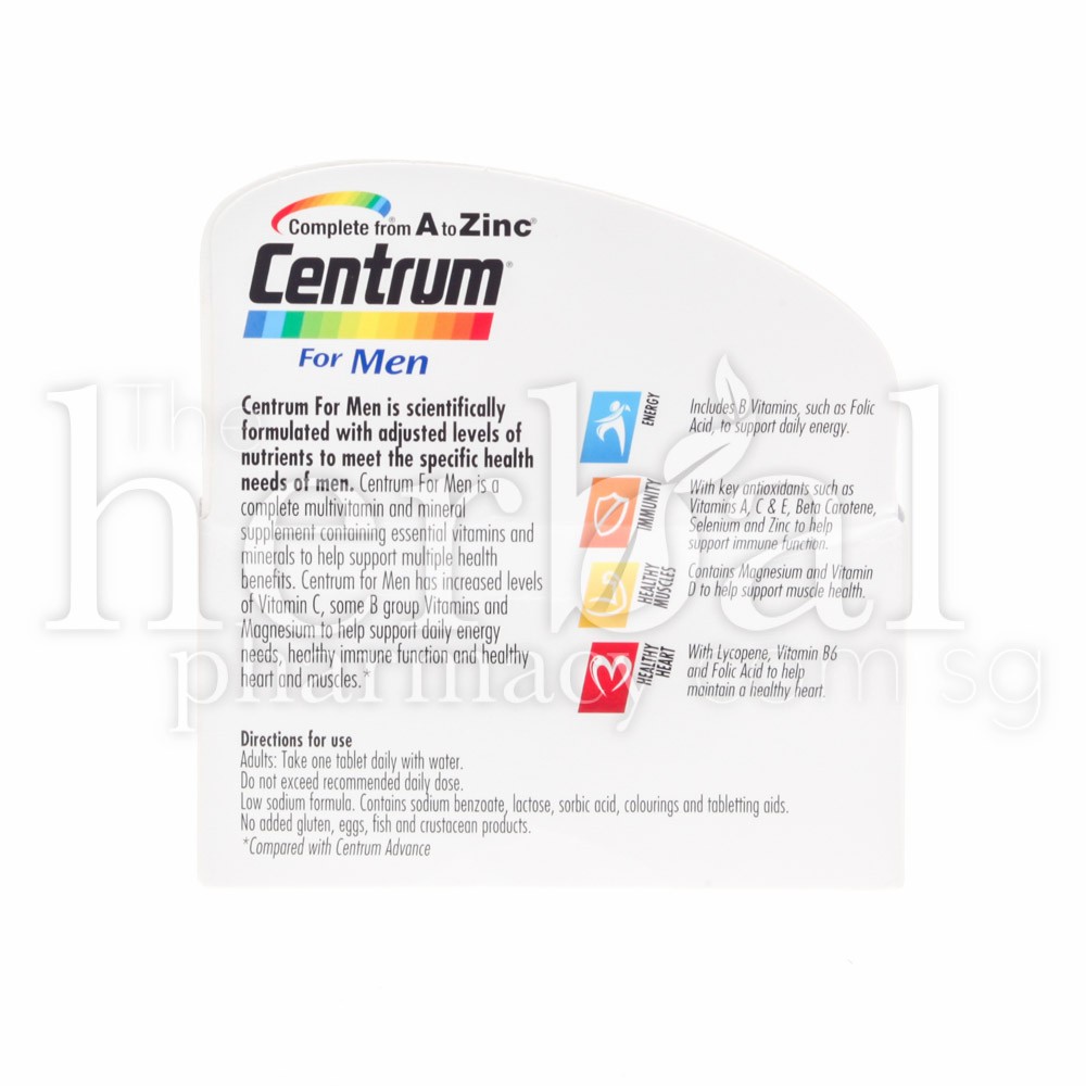 Centrum® for Men has Zinc and B-vitamins to maintain brain health. On top of the complete formulation of vitamins and minerals you trust from Centrum, Centrum® for Men also has more B vitamins, zinc to meet the unique health needs of men and fill nutritional gaps in their diet. Centrum® for Men has Lycopene, Vitamin B6, B12 and Folic Acid to help maintain a healthy heart. It also contains B Vitamins (Thiamin, Riboflavin, Niacin, B6, B12, Folic Acid, Pantothenic Acid, and Biotin) that play an important role in converting proteins, fats, and carbohydrates into energy and contains vitamins and minerals such as Vitamins A, C, and E, Selenium, Zinc, and Iron which helps support immune system. It contains magnesium, Vitamins D and B6 to support optimal muscle health.