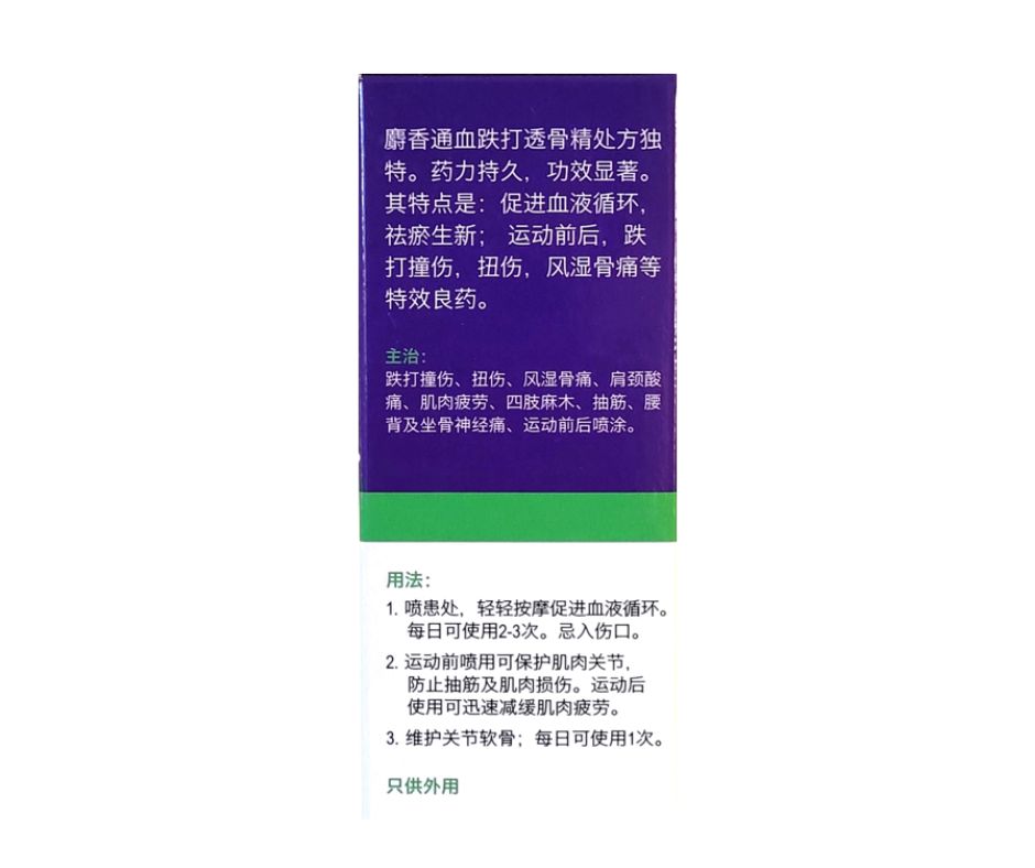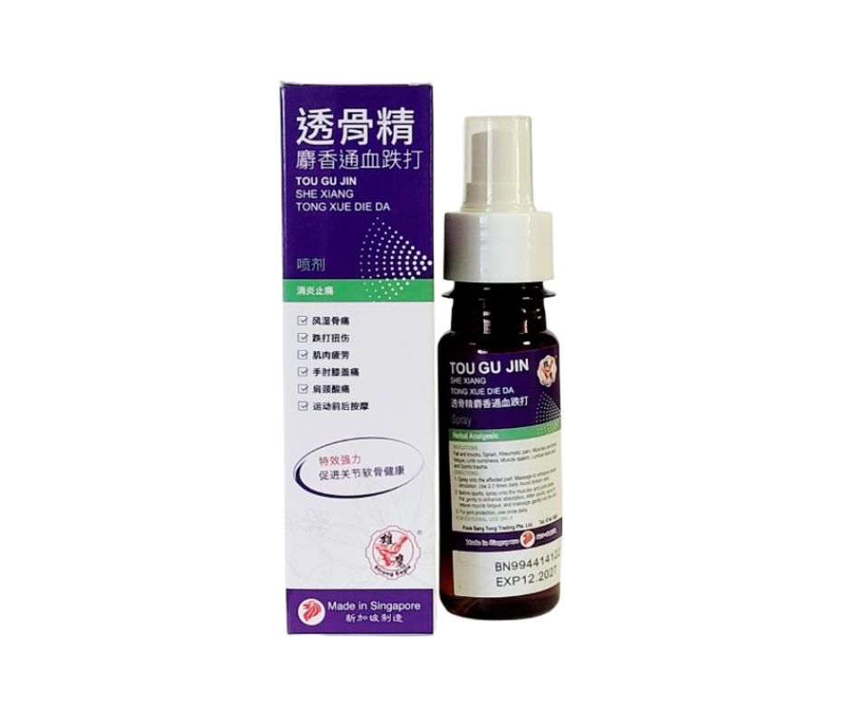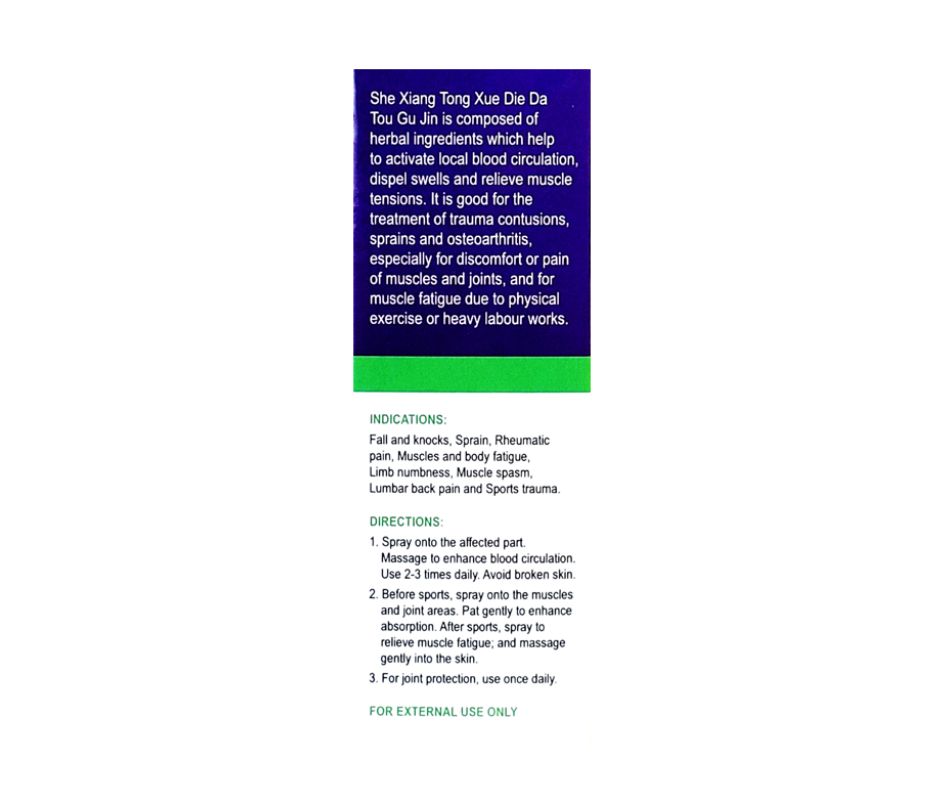 She Xiang Tong Xue Die Da Tou Gu Jin is composed of herbal ingredients which help to activate local blood circulation, dispel swells and relieve muscle tensions. It is good for the treatment of trauma contusions, sprains and osteoarthritis, especially for discomfort or pain of muscles and joints, and for muscle fatigue due to physical exercise or heavy labour works.