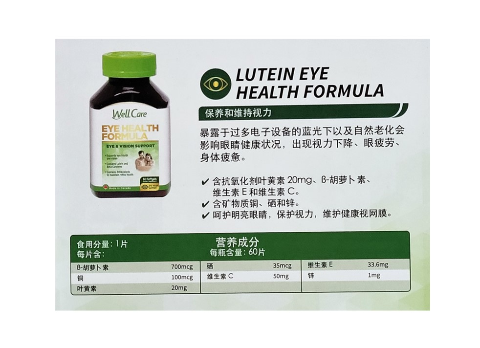 WellCare Eye Health Formula is a unique combination of Lutein, Antioxidants and Minerals to support your eye health and vision.